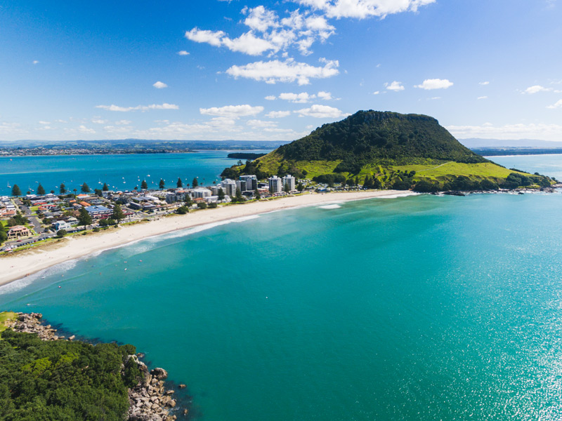Der namensgebende Mount Maunganui – auf Māori: Mauao – ist das Wahrzeichen der Region. Eine Wanderung auf seinen Gipfel dauert rund 30–45 Minuten und belohnt mit einem Panorama über Strand, Hafen und Stadt. Unterwegs begegnet man Schafen, Wildblumen und einer frischen Meeresbrise.