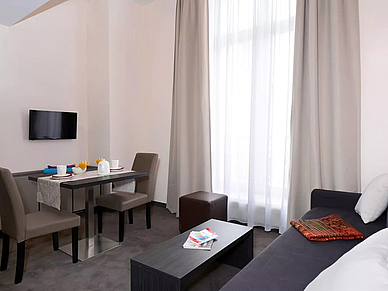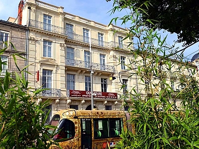 Residenz Appart Hotel Odalys im Einzelzimmer mit Bad und Küchenzeile. Die Residenz befindet sich im Stadtzentrum von Montpellier, nur etwa 300 Meter vom Place da la Comédie eintfernt. Klimaanlage, Lounge, Waschsalon (gegen Gebühr), gratis WLAN und Internetzugang. Bettwäsche und Handtücher werden gestellt. Die Entfernung zur Schule beträgt ca. 15 Gehminuten.