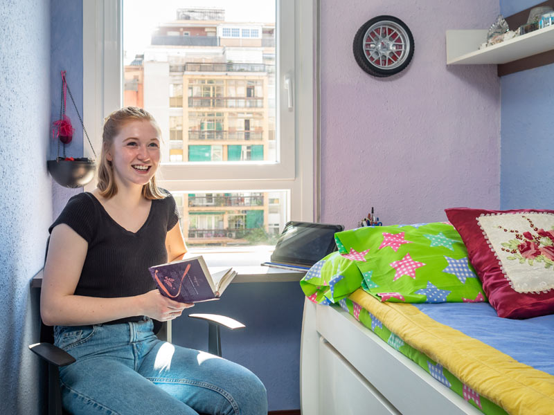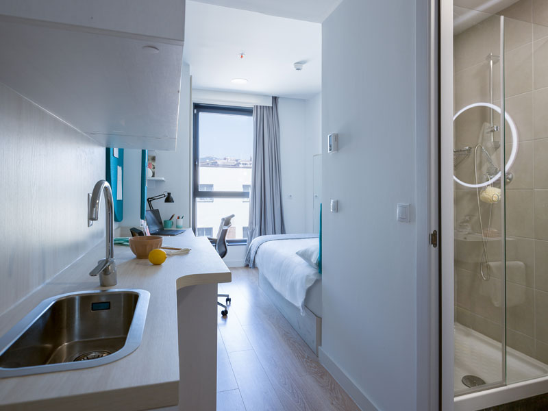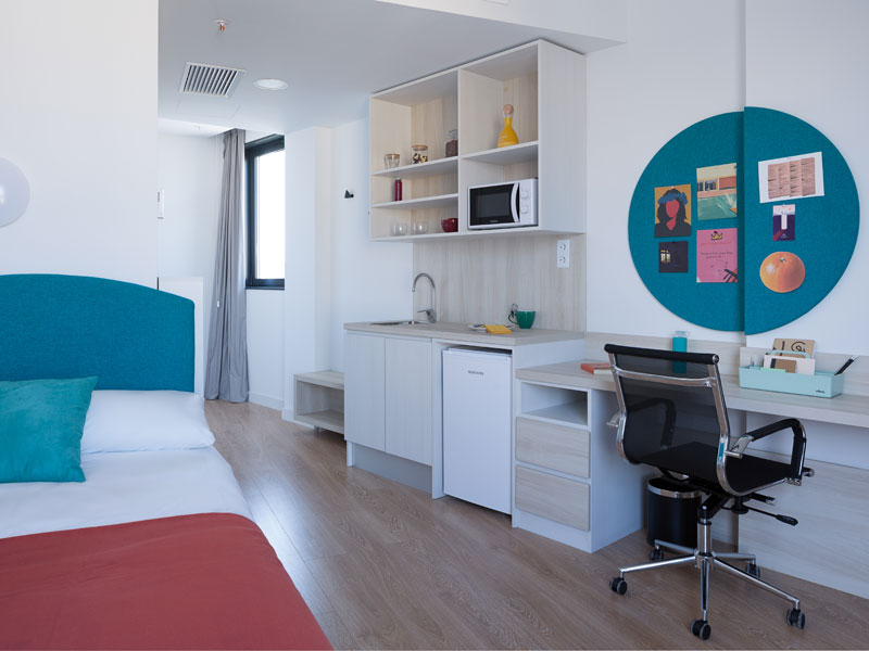 Moderne Studentenresidenz im Viertel Sants-Montjüic. Unterkunft im Einzelzimmer mit eigenem Bad und Küchenzeile. Selbstverpflegung. Handtücher und Bettwäsche werden gestellt. Waschmöglichkeit vorhanden (Gebühr). WLAN inklusive. Gemeinschaftsbereiche, Studierzimmer und Fitnessraum im Gebäude. Es gibt eine Cafeteria, in der Frühstück, Halb- oder Vollpension vor Ort gegen Aufpreis tageweise zugebucht werden kann. Die Entfernung zur Schule beträgt ca. 12 Fahrminuten. Buchbar ab 18 Jahren.