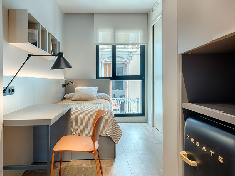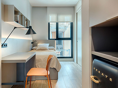 Zentral gelegenes neues Wohnheim Resiolé Boutique in unmittelbarer Nähe zur Sprachschule. Komfortable Einzel- oder Doppelzimmer mit privatem Bad. Selbstverpflegung. Es gibt eine Küche, einen Gemeinschaftsraum sowie eine Außenterrasse und Waschmöglichkeiten. WLAN ist inklusive. Handtücher und Bettwäsche werden gestellt. Wöchentliche Reinigung und Wäscheservice. Die Zimmer verfügen über Heizung und Klimaanlage sowie eigenen Kühlschrank. 1/2 Doppelzimmer ist für Alleinreisende nicht buchbar. Die Entfernung zur Schule beträgt etwa 9 Gehminuten.