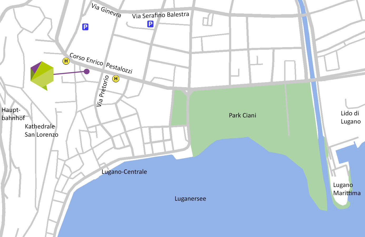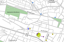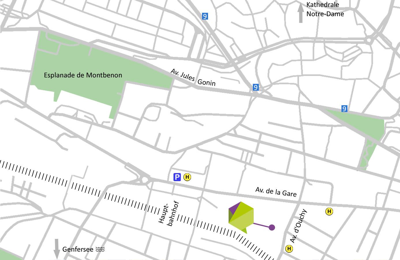 - Gehen Sie beim Bahnhof Ausgang rechts der Av. de la Gare entlang bis zur Kreuzung Av. d'Ouchy. Dann rechts in die Av. d'Ouchy gehen und wir sind 50m rechts.