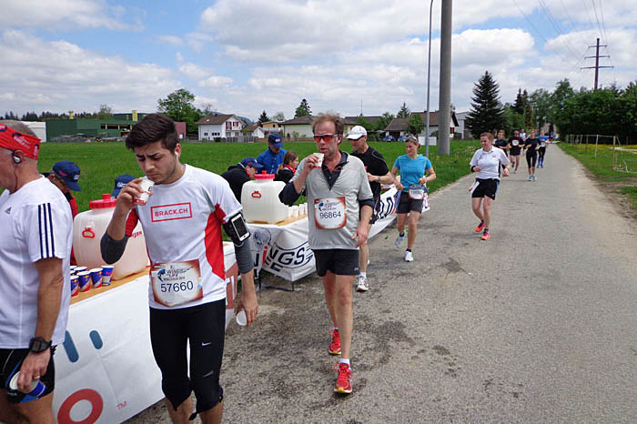 Wir mussten anschließend noch bis ca. KM 28 durch ein sehr schönes Wohngebiet entlang der Aare laufen, wo dann endlich der Bus auf uns wartete. Im Bus stärkten wir uns mit einem Red Bull Cola und fuhren dann zum Start zurück.