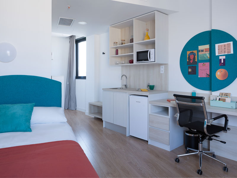 Residenza moderna nel quartiere di Sants-Montjüic, a circa 20 minuti di mezzi pubblici dalla scuola di lingue. Vivrete in una camera singola con bagno e angolo cottura. La mezza pensione è inclusa. È disponibile la connessione WLAN. Vengono forniti asciugamani e lenzuola. Ci sono diverse aree comuni, tra cui una sala cinema, una sala fitness e aule studio. Età minima 18 anni.